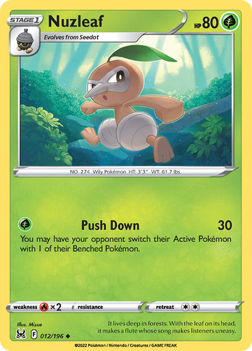 Losse Pokémon kaart 012/196 - Nuzleaf - [Uncommon]. Een losse Pokémon kaart uit Lost Origin...